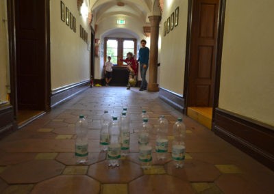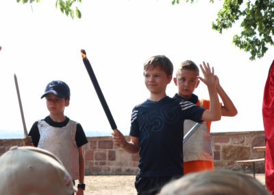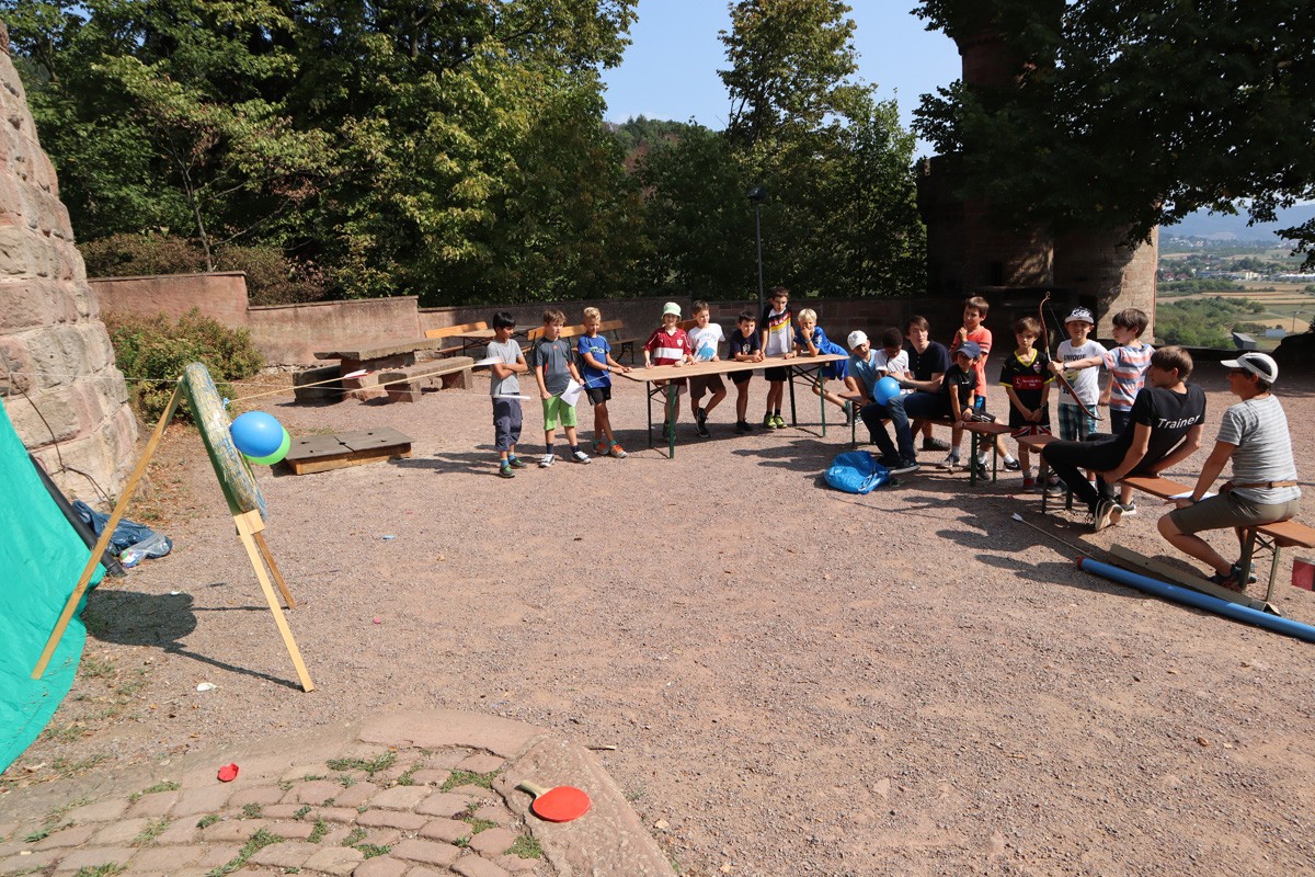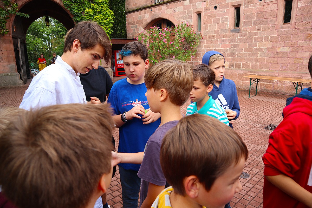 Mit diesen Worten ward am Nachmittag des zweiten Freizeittages die traditionsreiche Hymnusiade eröffnet worden. Des Königs Augen wurden nicht enttäuscht, durfte er doch im Laufe des Nachmittages eine große Zahl an Rekorden und außergewöhnlichen Leistungen bestaunen; ob bei althergebrachten Stationen wie dem Kistenlauf, dem Nagelschlagen oder der Space Sau (ein Hindernislauf nach mehrmaliger Umdrehung um die eigene Achse, was zu gewissen Schwindelgefühlen führt, Anmerkung des Chronisten) oder auch bei neuen anspruchsvollen Techniken wie dem Bogenschießen oder dem Obstkernspucken war der Eifer und Einsatz der Sänger groß. Ebenso wie bei den Proben dieses Tages, in denen die Werke Brahms‘, Dysons und Eggerts erklangen. So neigt sich bereits der zweite Freizeittag dem Ende entgegen und die Nacht bricht über der Ortenburg herein.