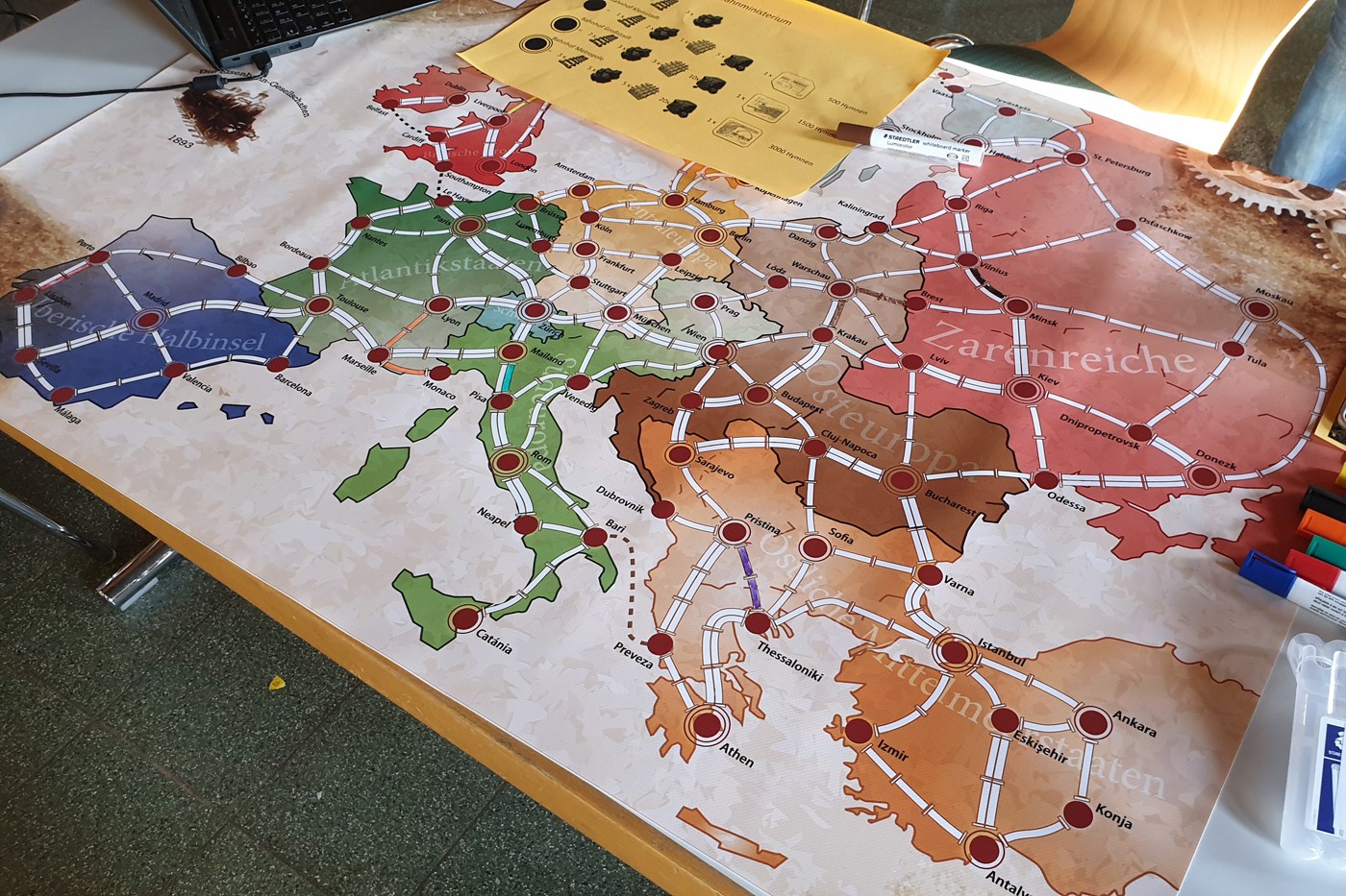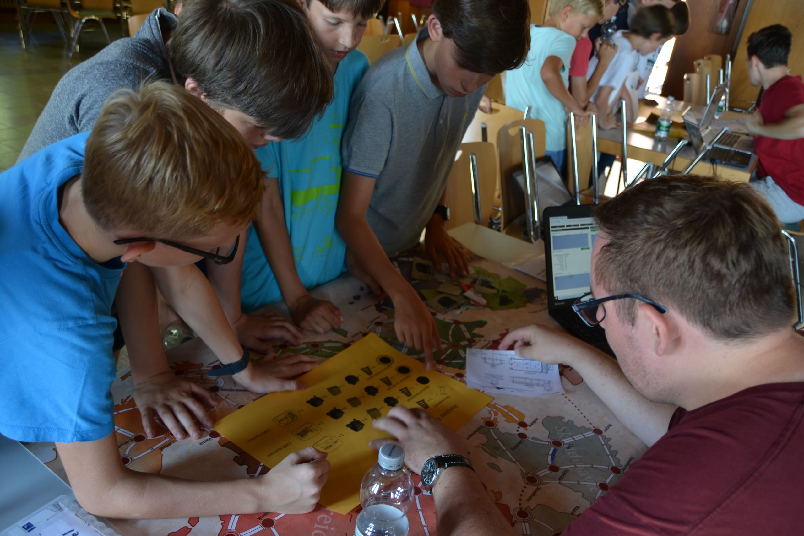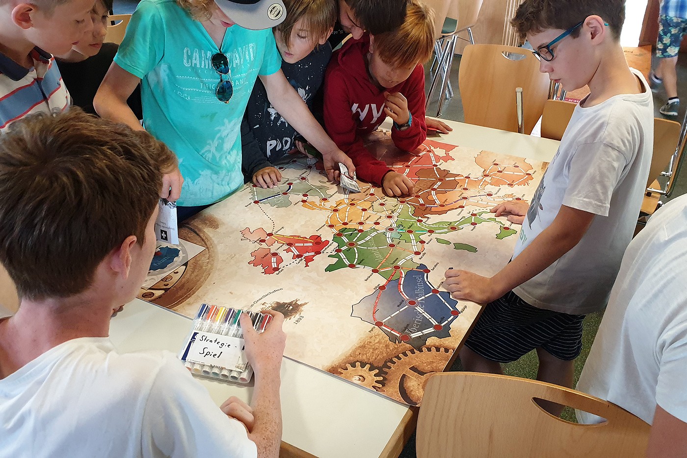 Das diesjährige Strategiespiel machte es 8 Eisenbahngesellschaften zur Aufgabe ein Streckennetz quer durch Europa zu bauen. Die Eisenbahngesellschaften befinden sich im Jahr 1893. Die Zugverbindungen stehen gerade in den Startlöchern und so konkurrieren die 8 Gesellschaften um die Oberhand in Europas zukünftigem Schienennetz und Prestige der ersten Strecken. Das Spiel lebt von einer Vielzahl von Charakteren, verkörpert vom Männerchor, die den Teams helfen beim Bau ihrer Linien, indem sie Rohstoffe veredeln, mit den Teams handeln und Aufträge vergeben. Wenn die Gesellschaften sich klug anstellen, klug investieren und die richtigen Entscheidungen treffen, setzten sie sich durch gegen ihre Mitbewerber um die Krone Europas. Heute war der erste Teil und in der nächsten Woche folgt der zweite Teil des Spiels und die Situation spitzt sich zu. Wie Sie bestimmt bemerkt haben, ist das Spiel gar nicht so unkompliziert und sehr facettenreich. Die Knaben erkunden das Spiel und erlernen es auf diese Weise.