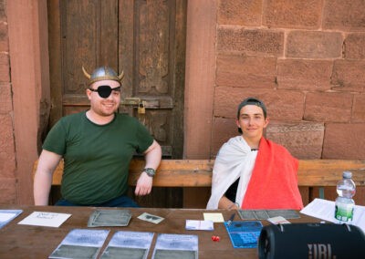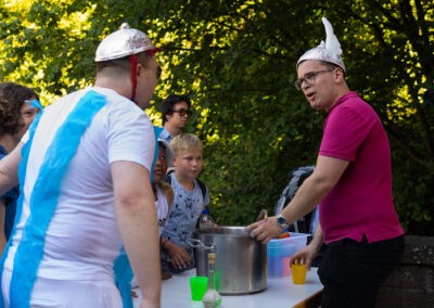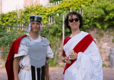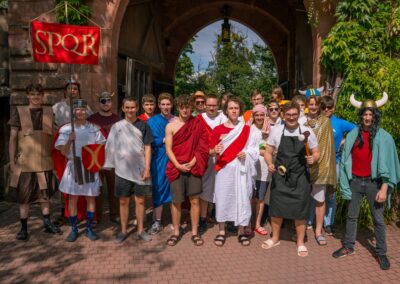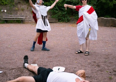 Der Nachmittag hielt dann ein besonderes Spektakel bereit: die Olympischen Spiele in Begleitung des unerschrockenen Galliers Hymnix! Inmitten glühender Hitze (auf dem Golfplatz hatte es sogar stolze 34,5 °C) traten die Sänger in verschiedenen Disziplinen gegeneinander an. Das Sesterzen-Schätzen erforderte scharfen Verstand, während das Hinkelstein-Stemmen den stärksten Sängern zutage brachte. Die Wagenrennen brachten den einen oder anderen ins Schwitzen, und beim Bedienen des römischen Katapults kam es zu so mancher Überraschung. Der Schweiß rann in Strömen, aber der Spaß war unermesslich.