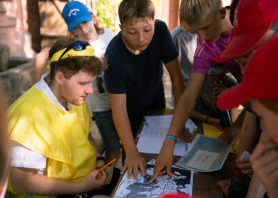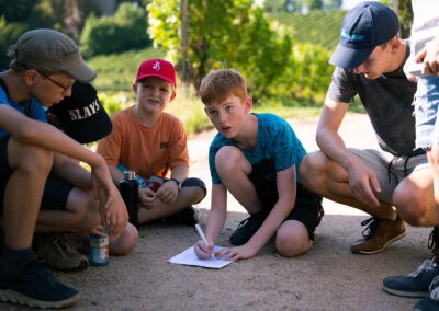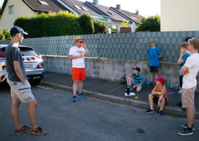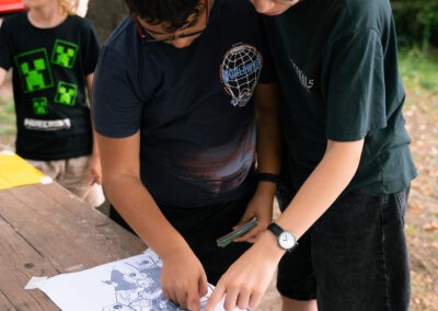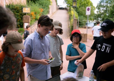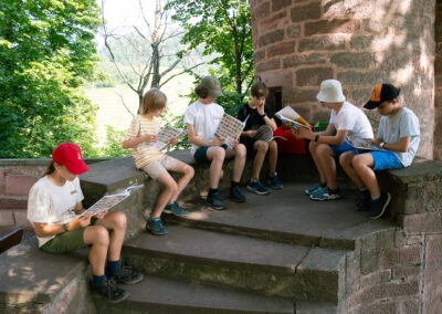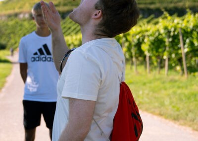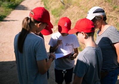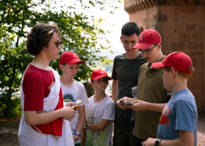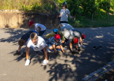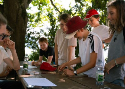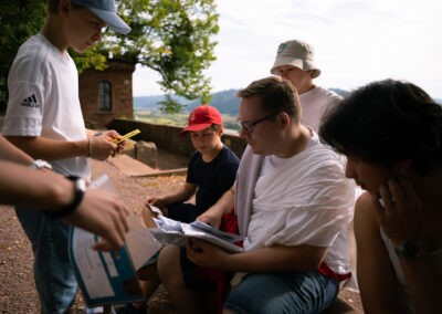 Zum ersten Nachmittagsprogramm galt es an vier Dinge zu denken: Kopfbedeckung, Trinkflasche, mit Sonnencreme eincremen, festes Schuhwerk. Es stand nicht etwa die lang geplante Wanderung nach Fischbach an, nein, heute war ein Geländespiel geplant!