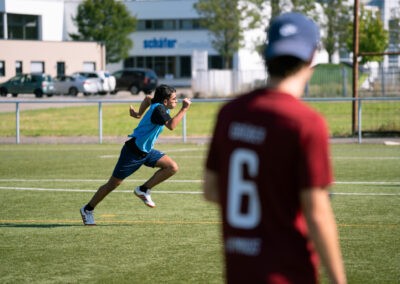Am Nachmittag lernten wir Cicmitfus kennen. Der extra aus Rom angereiste Sportler zeigte uns eine Sportart, die gerade der letzte Schrei in Rom ist: Zwei Mannschaften treten gegeneinander an, die Grünen und die Blauen (die nur zufällig so heißen wie die Circusparteien der Wagenrennen). Es geht darum, einen Ball in den Rahmen auf der Grundlinie des Gegners zu befördern. Die Hände zu verwenden, ist nicht erlaubt. Der Ball darf nur getreten werden. Das Spiel klingt komplizierter, als es ist, und wir verstanden es sehr schnell. Wir fanden mit dem Kunstrasenfeld des SV Ortenberg sogar einen geeigneten Platz, um das Spiel auszuprobieren.