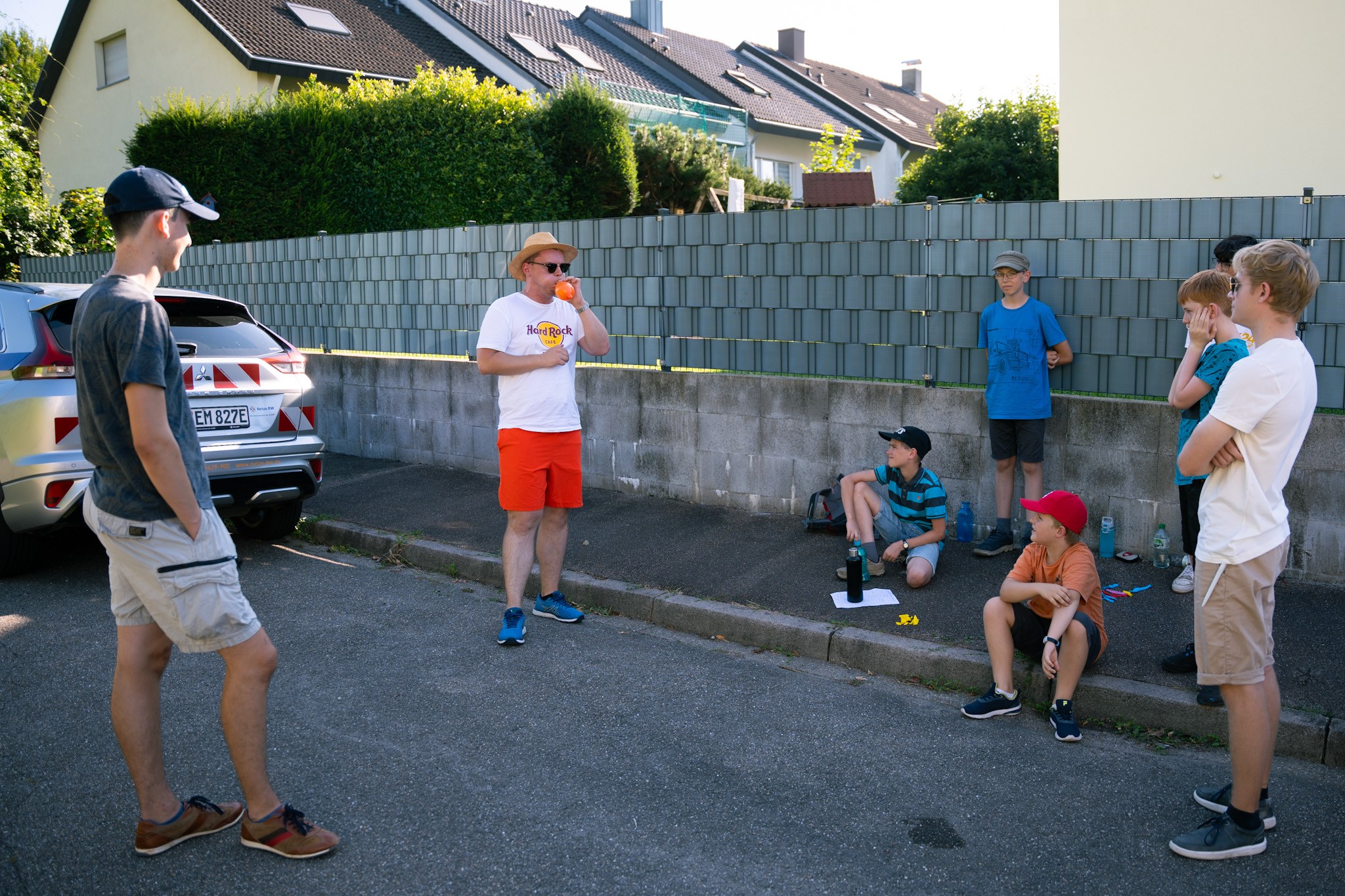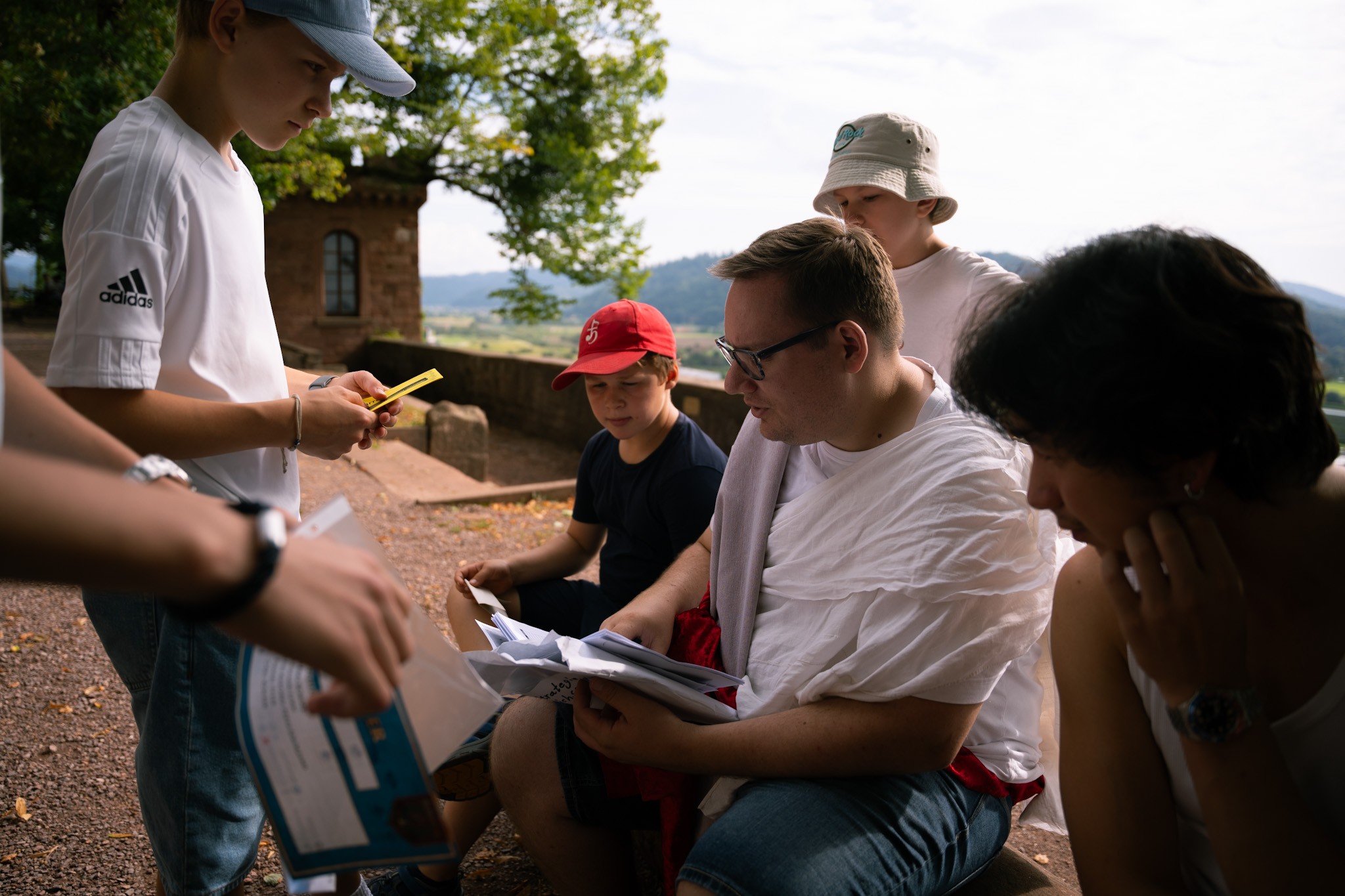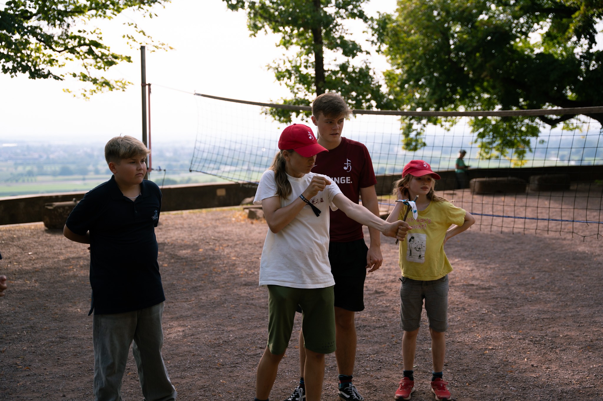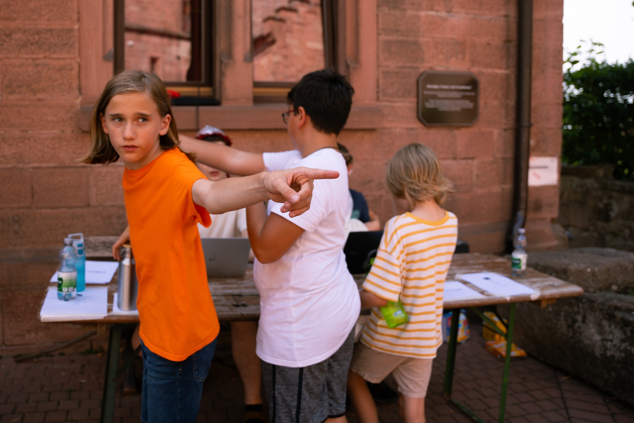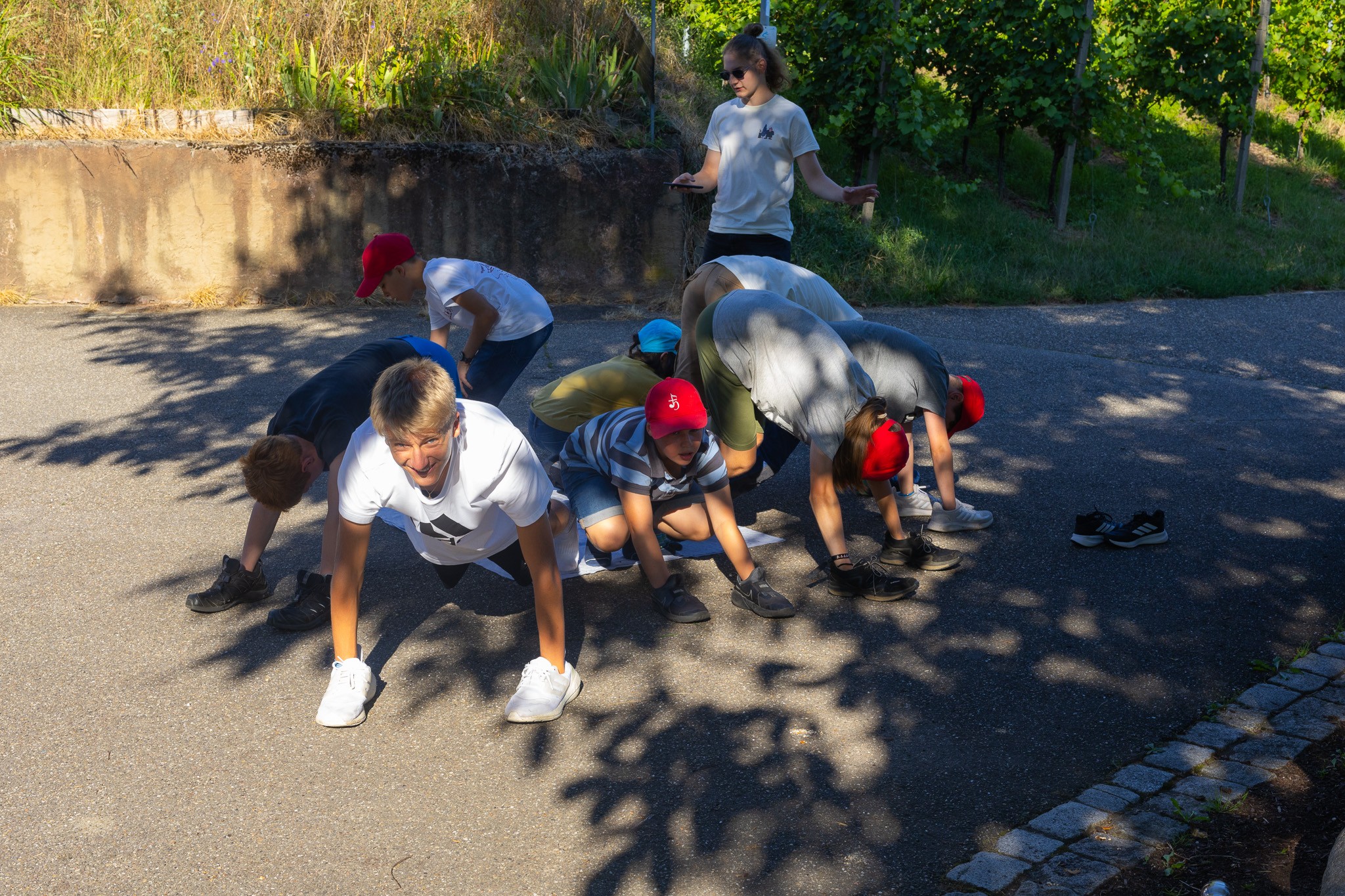 Zum ersten Nachmittagsprogramm galt es an vier Dinge zu denken: Kopfbedeckung, Trinkflasche, mit Sonnencreme eincremen, festes Schuhwerk. Es stand nicht etwa die lang geplante Wanderung nach Fischbach an, nein, heute war ein Geländespiel geplant!