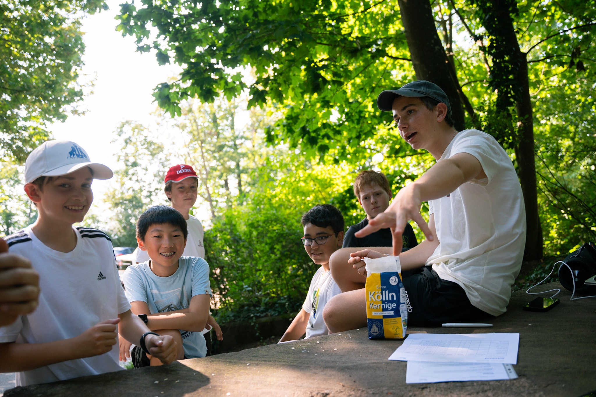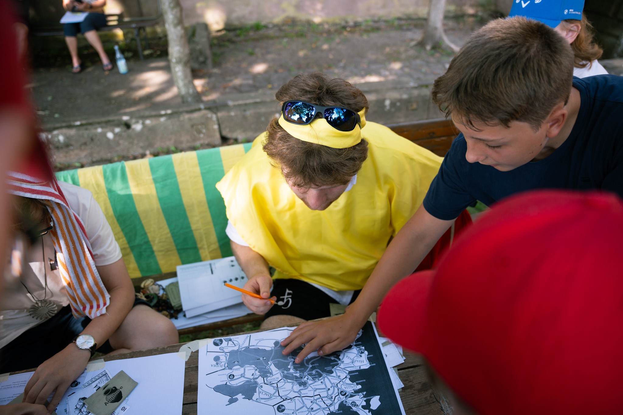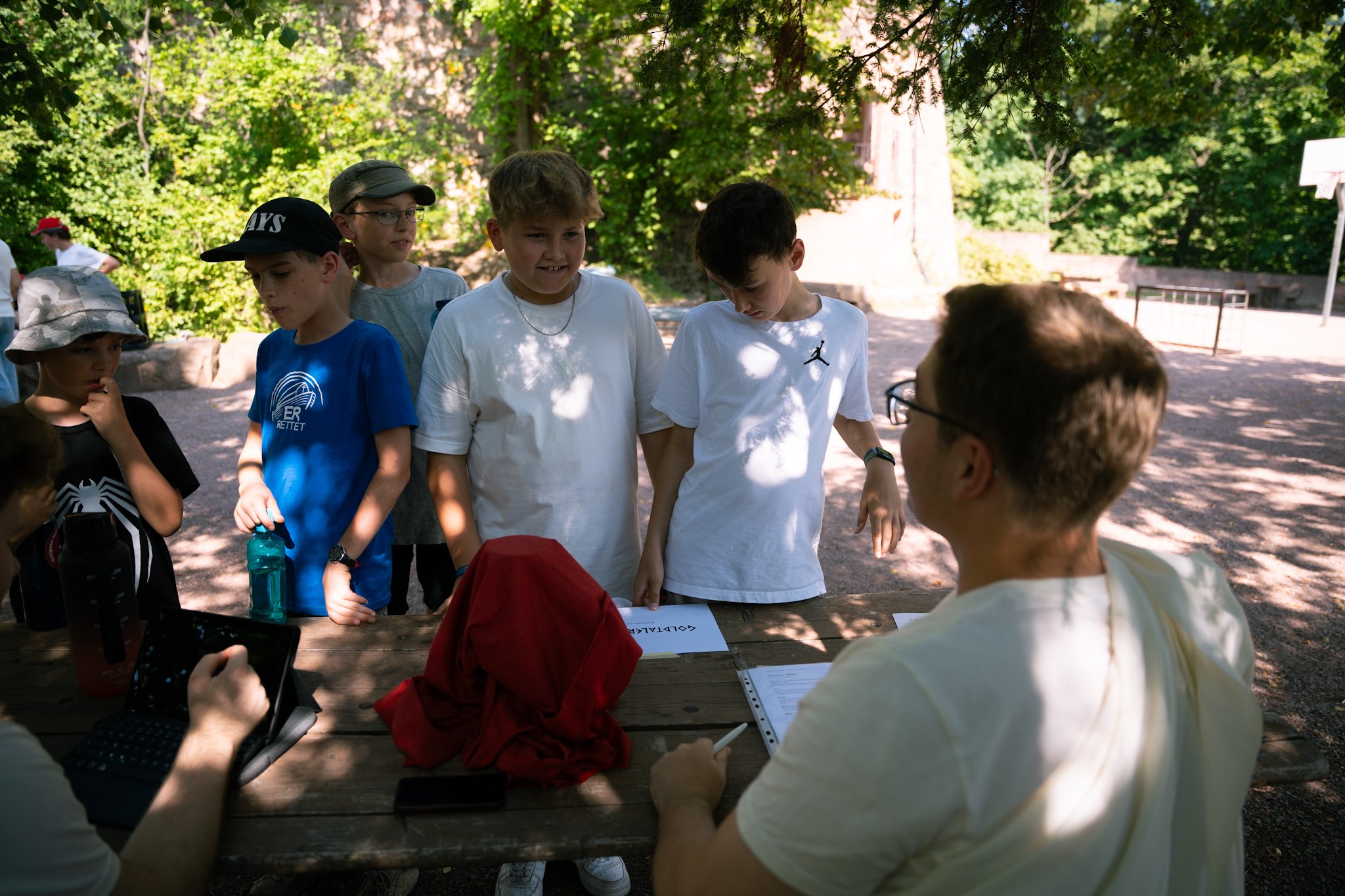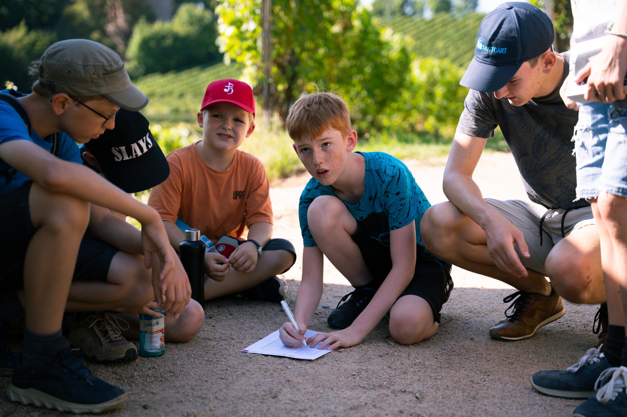Zum ersten Nachmittagsprogramm galt es an vier Dinge zu denken: Kopfbedeckung, Trinkflasche, mit Sonnencreme eincremen, festes Schuhwerk. Es stand nicht etwa die lang geplante Wanderung nach Fischbach an, nein, heute war ein Geländespiel geplant!