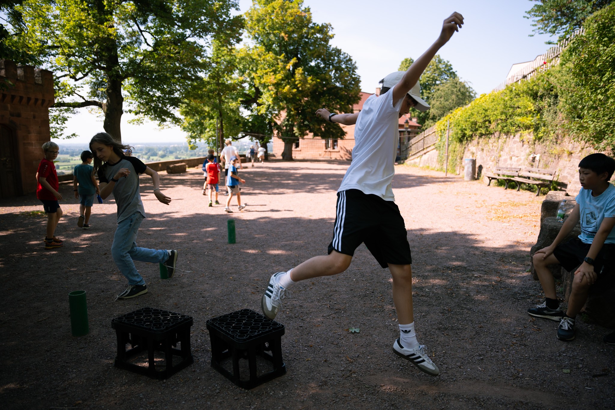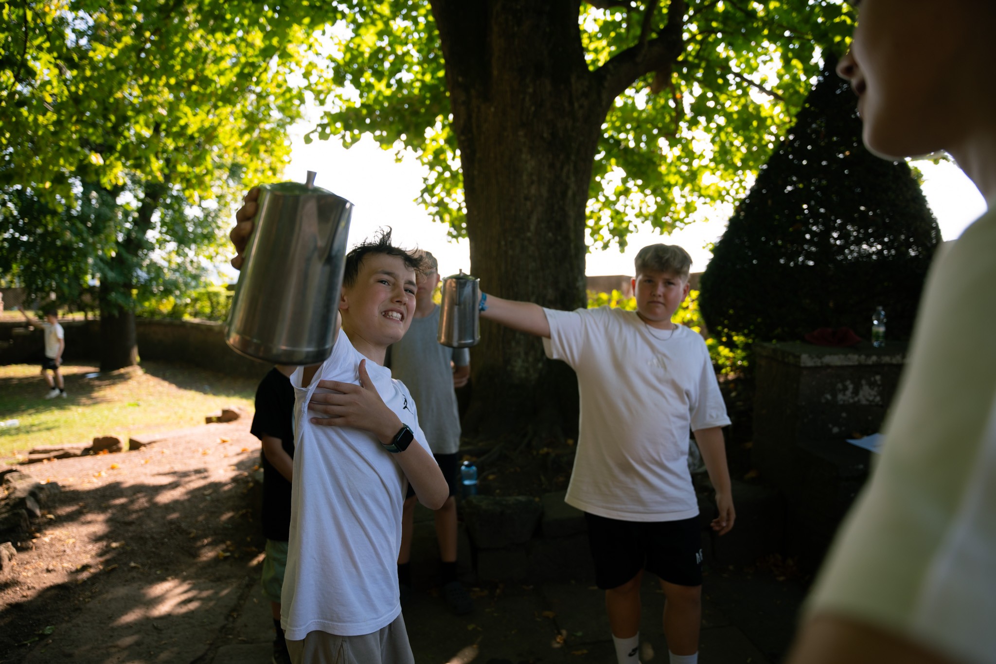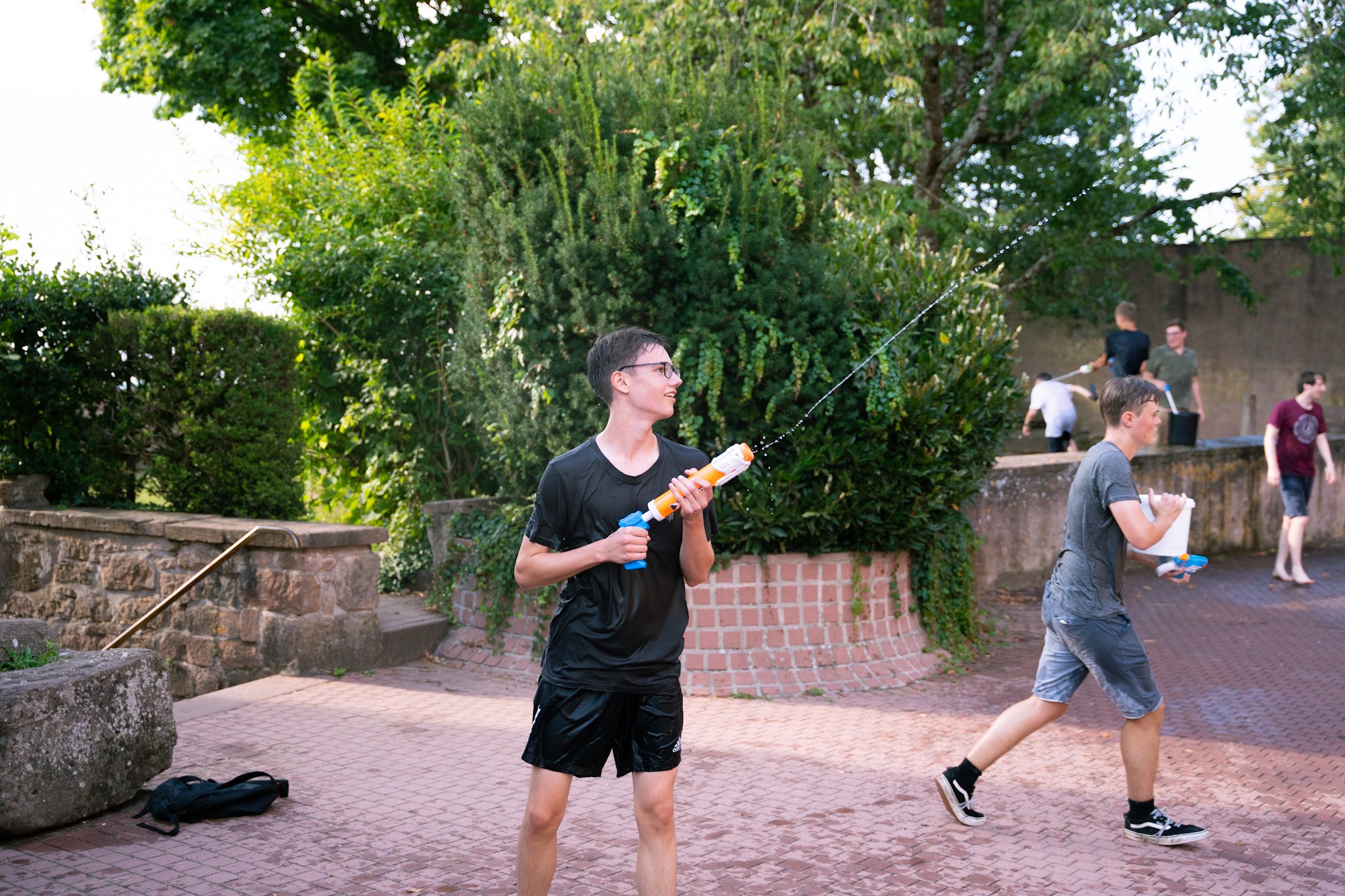 Doch das war noch nicht das Ende unseres Abenteuers. Am späten Nachmittag machten wir uns zu Fuß auf den Rückweg zur Burg. Oben angekommen, erwartete uns eine willkommene Überraschung: Auf dem Burghof war eine Wasserschlacht vorbereitet! Nach der Hitze des Tages war dies die perfekte Erfrischung, und wir stürzten uns begeistert ins kühle Nass.
