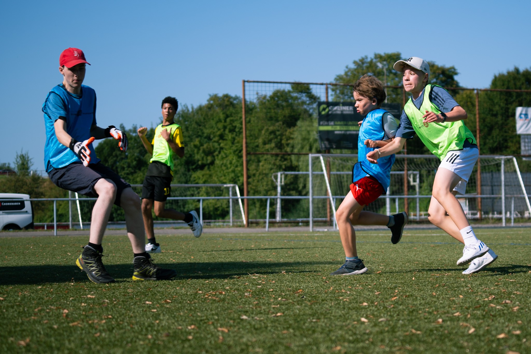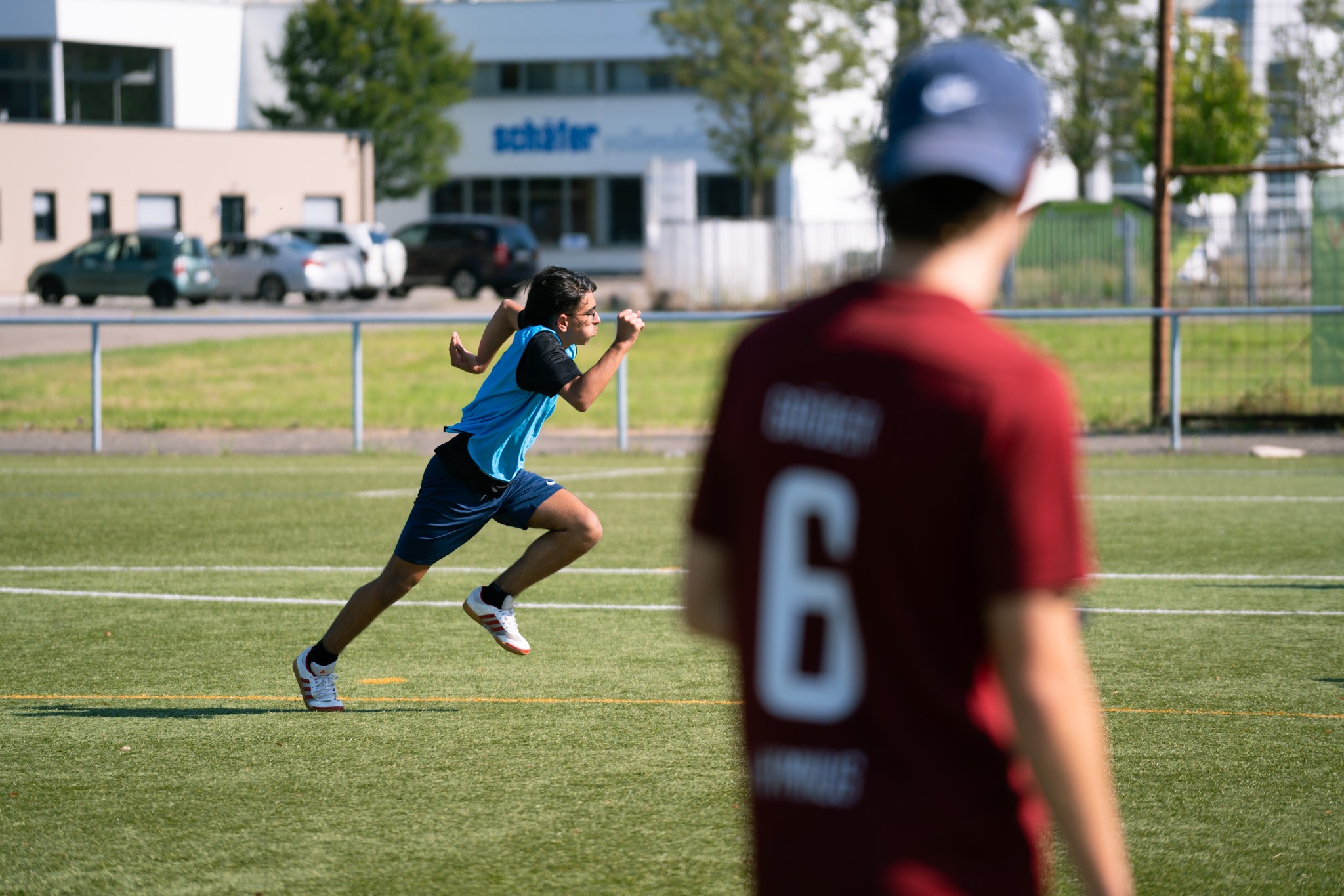 Am Nachmittag lernten wir Cicmitfus kennen. Der extra aus Rom angereiste Sportler zeigte uns eine Sportart, die gerade der letzte Schrei in Rom ist: Zwei Mannschaften treten gegeneinander an, die Grünen und die Blauen (die nur zufällig so heißen wie die Circusparteien der Wagenrennen). Es geht darum, einen Ball in den Rahmen auf der Grundlinie des Gegners zu befördern. Die Hände zu verwenden, ist nicht erlaubt. Der Ball darf nur getreten werden. Das Spiel klingt komplizierter, als es ist, und wir verstanden es sehr schnell. Wir fanden mit dem Kunstrasenfeld des SV Ortenberg sogar einen geeigneten Platz, um das Spiel auszuprobieren.