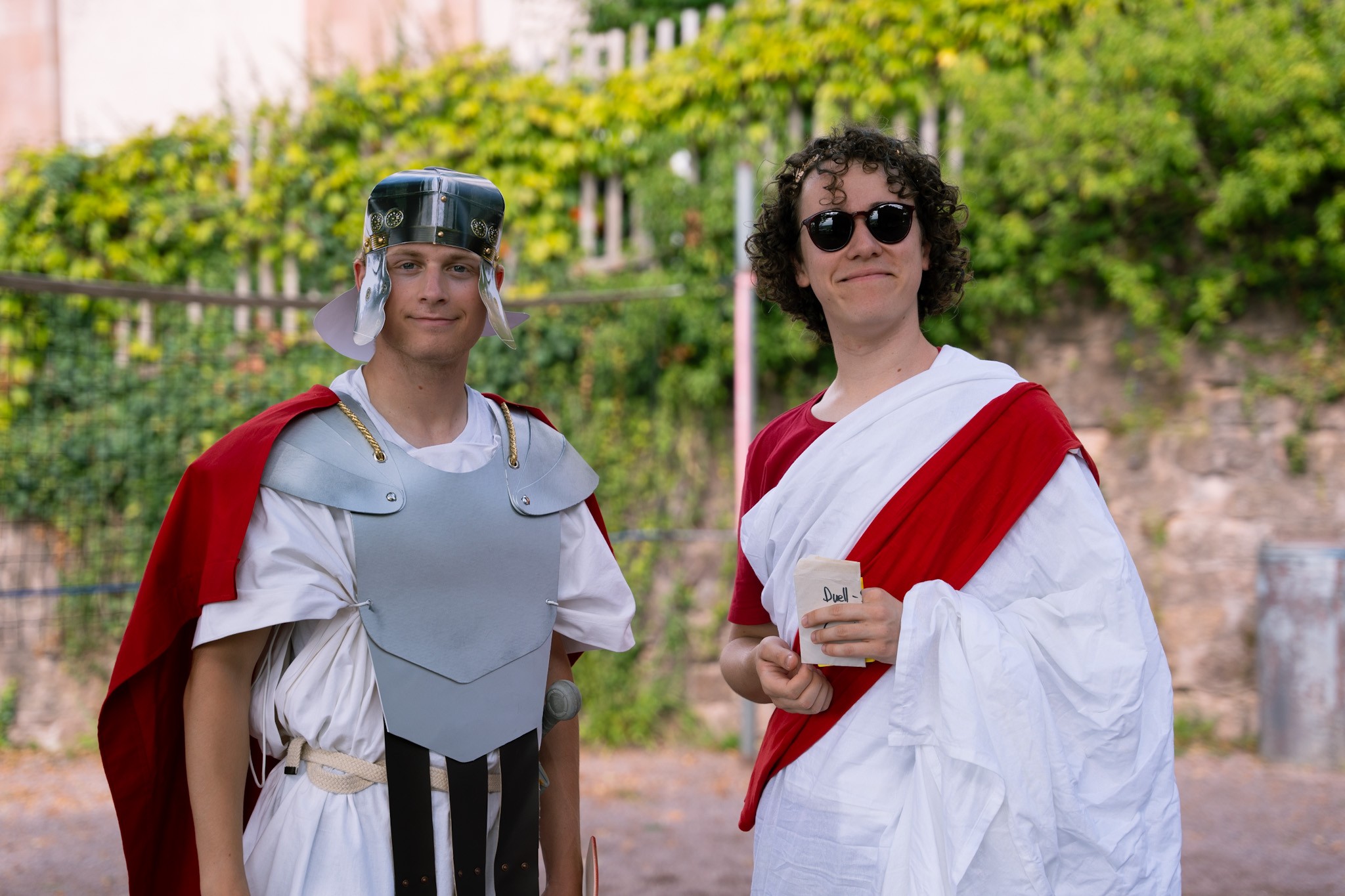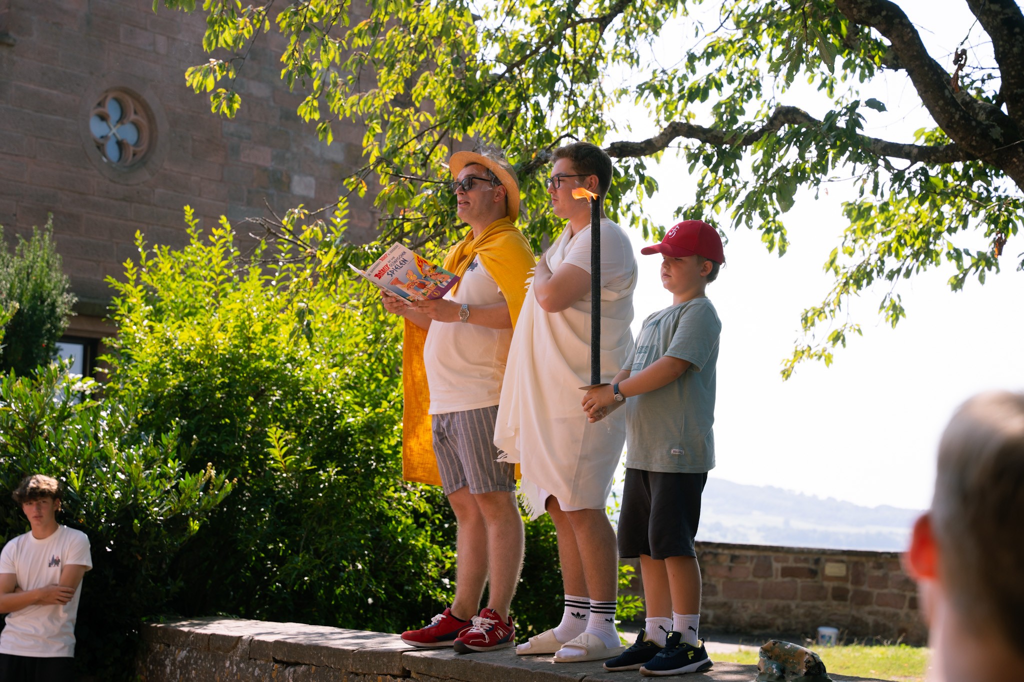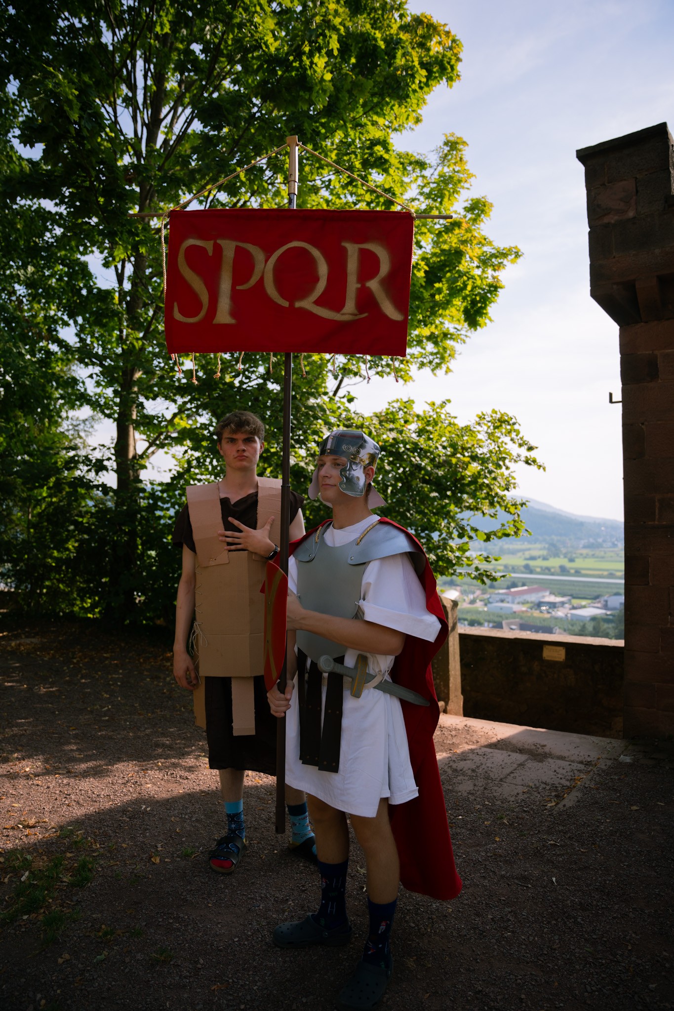 Mit zwei Bussen kam die Zenturie der Schwaben heute an. Den Ortenberg erklommen, wussten sie die kühlen Mauern sehr zu schätzen. Am Burgtor standen aber Torwächter, die penibel darauf achteten, dass kein Römer in die Burg kommt: Asterix und Obelix schenkten den Ankömmlingen daraufhin sogar etwas von ihrem berühmt-berüchtigten Zaubertrank aus.