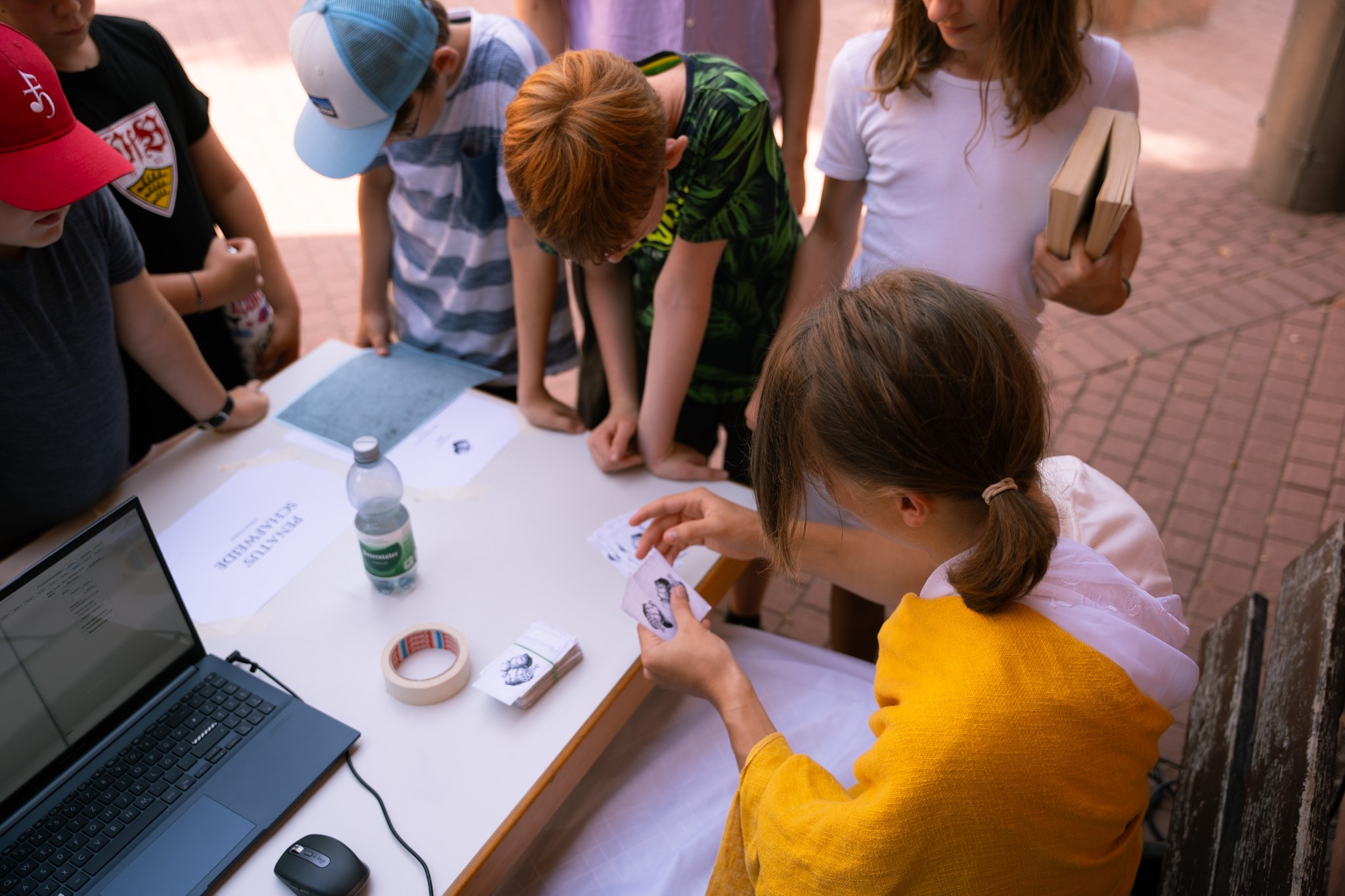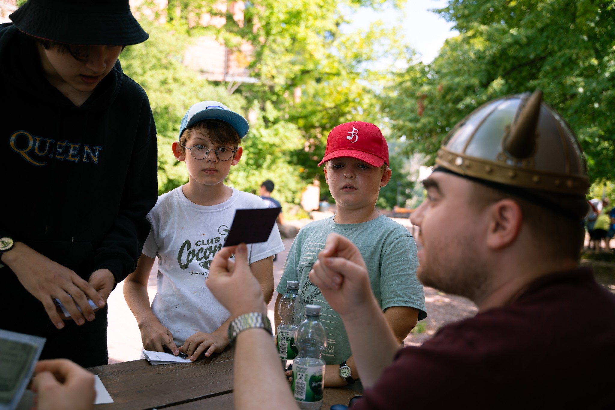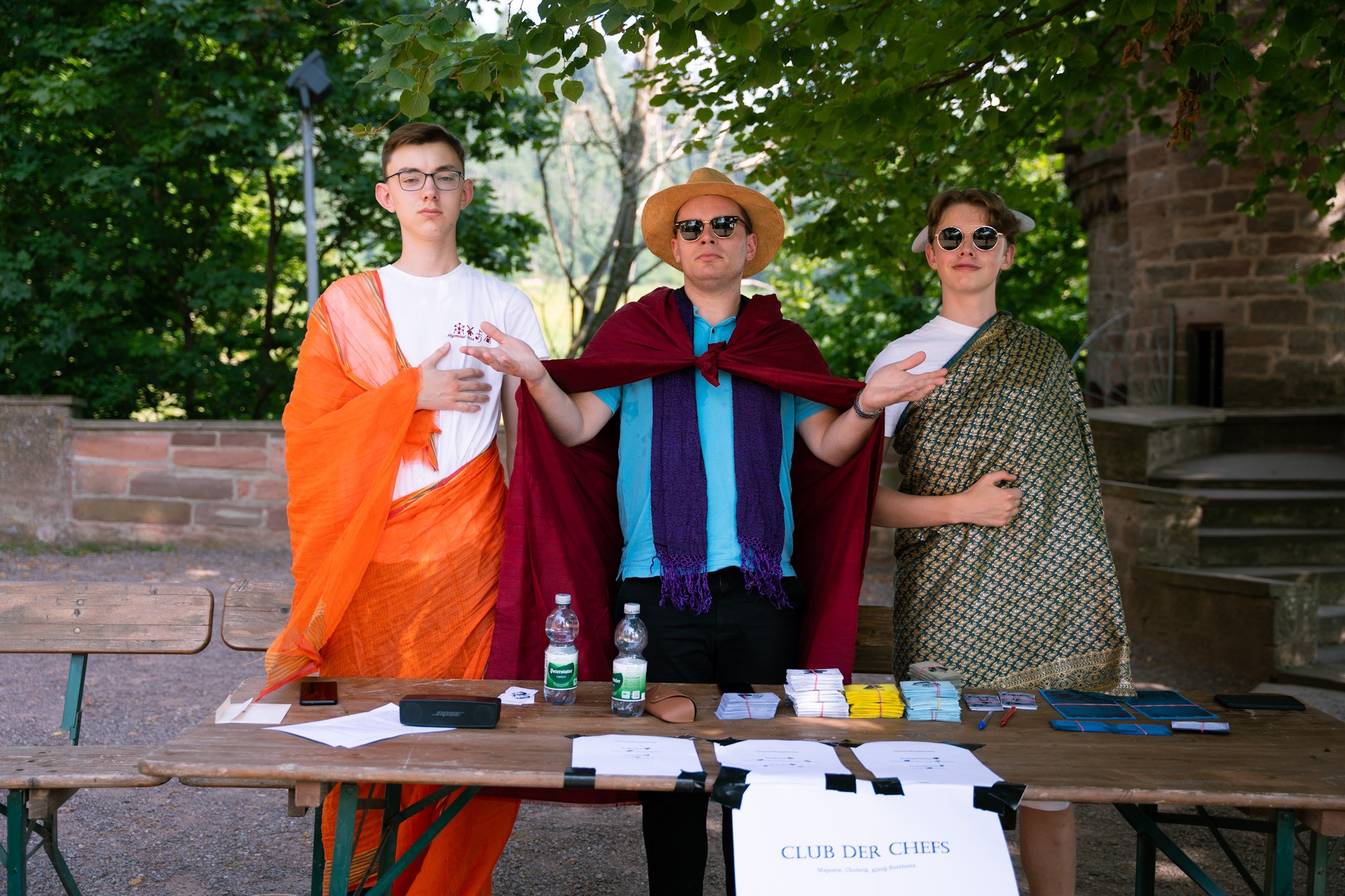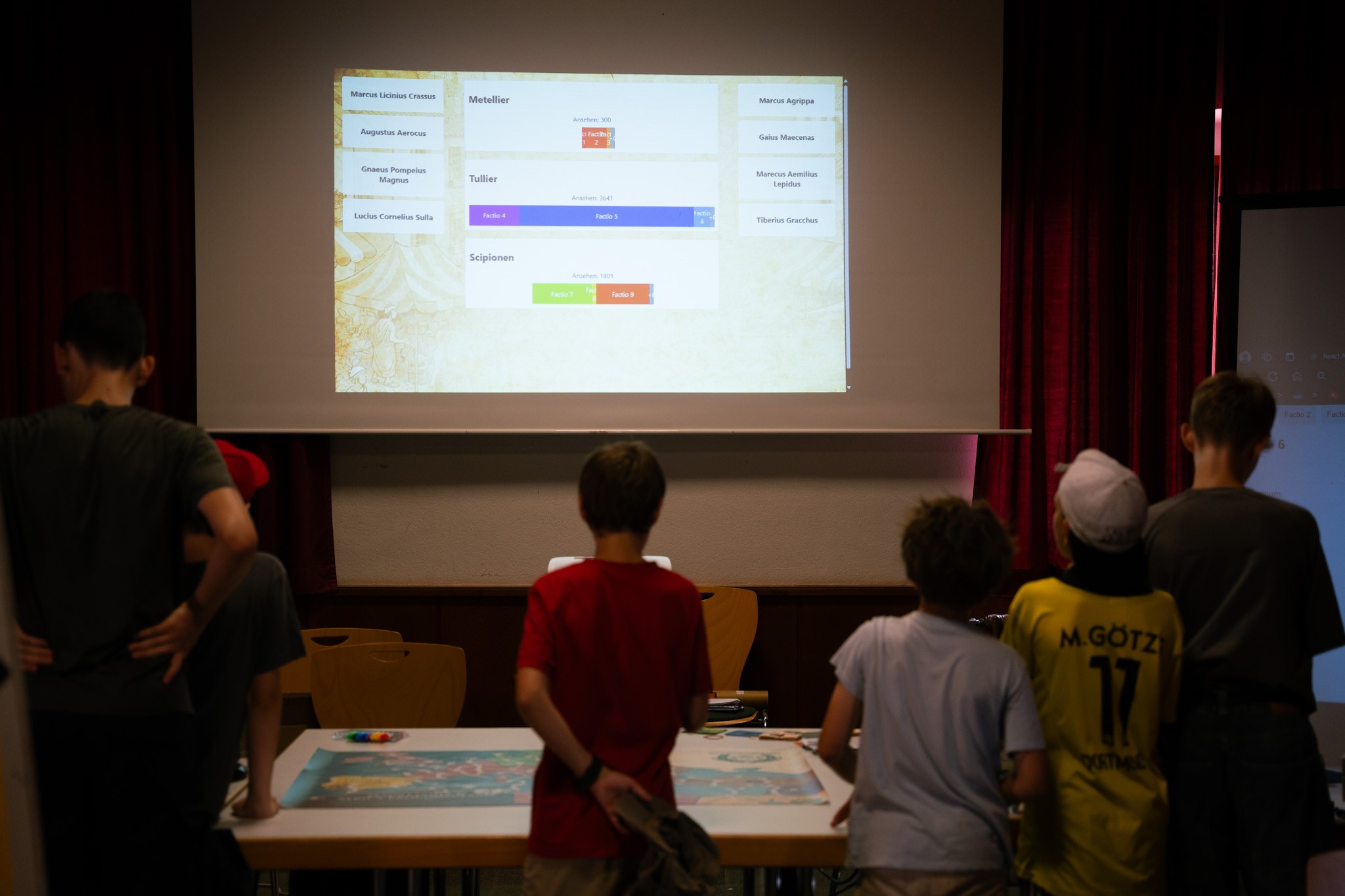 Daraufhin gab es als Nachmittagsprogramm des Strategiespiels zweiter Teil. Jetzt heißt es wieder Rohstoffe sammeln, Waren veredeln, Abenteuer starten, Duelle gewinnen, Handelswege erschließen, Gebäude bauen, Transportkapazitäten erhöhen, und so weiter. Auf dem ganzen Hof schwirren Sänger umher, um möglichst schnell von einer Station zur nächsten zu kommen. Im Gartensaal stehen Viele, um einen Blick auf das sich stets aktualisierende Scoreboard zu werfen. Und immer und überall hört man „Ave Caesar!“, wie es Pflicht ist, wenn Caius Iulius Caesar an einer Gruppe vorbeischreitet. Zwischen 17:15 und 17:40 Uhr schließen die Stationen, doch wir hätten noch lange weiter spielen können. So viele glückliche Kinderaugen belohnen auch die unglaublich große Arbeit, die das Team in die Vorbereitung gesteckt hat.