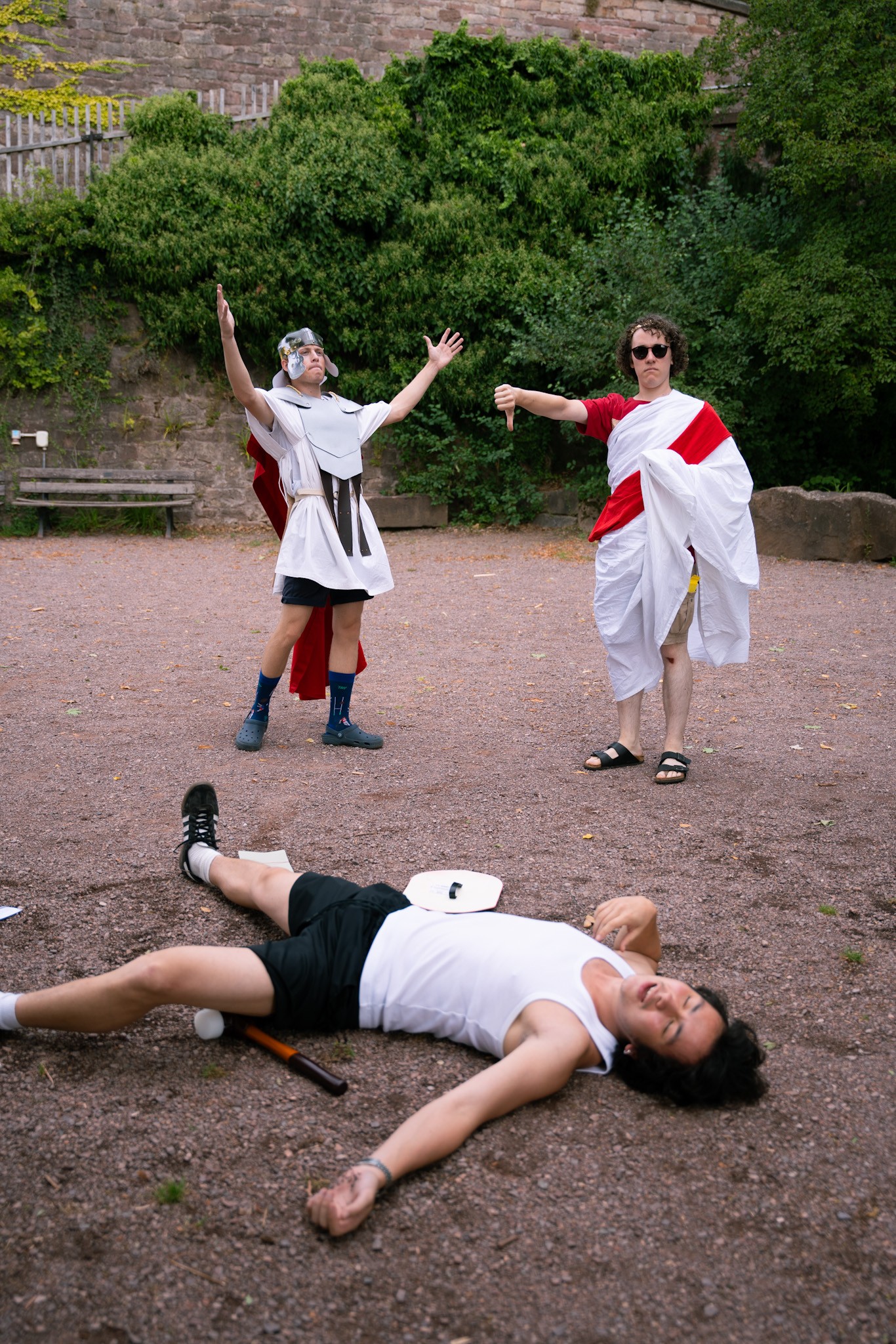 Der Nachmittag hielt dann ein besonderes Spektakel bereit: die Olympischen Spiele in Begleitung des unerschrockenen Galliers Hymnix! Inmitten glühender Hitze (auf dem Golfplatz hatte es sogar stolze 34,5 °C) traten die Sänger in verschiedenen Disziplinen gegeneinander an. Das Sesterzen-Schätzen erforderte scharfen Verstand, während das Hinkelstein-Stemmen den stärksten Sängern zutage brachte. Die Wagenrennen brachten den einen oder anderen ins Schwitzen, und beim Bedienen des römischen Katapults kam es zu so mancher Überraschung. Der Schweiß rann in Strömen, aber der Spaß war unermesslich.